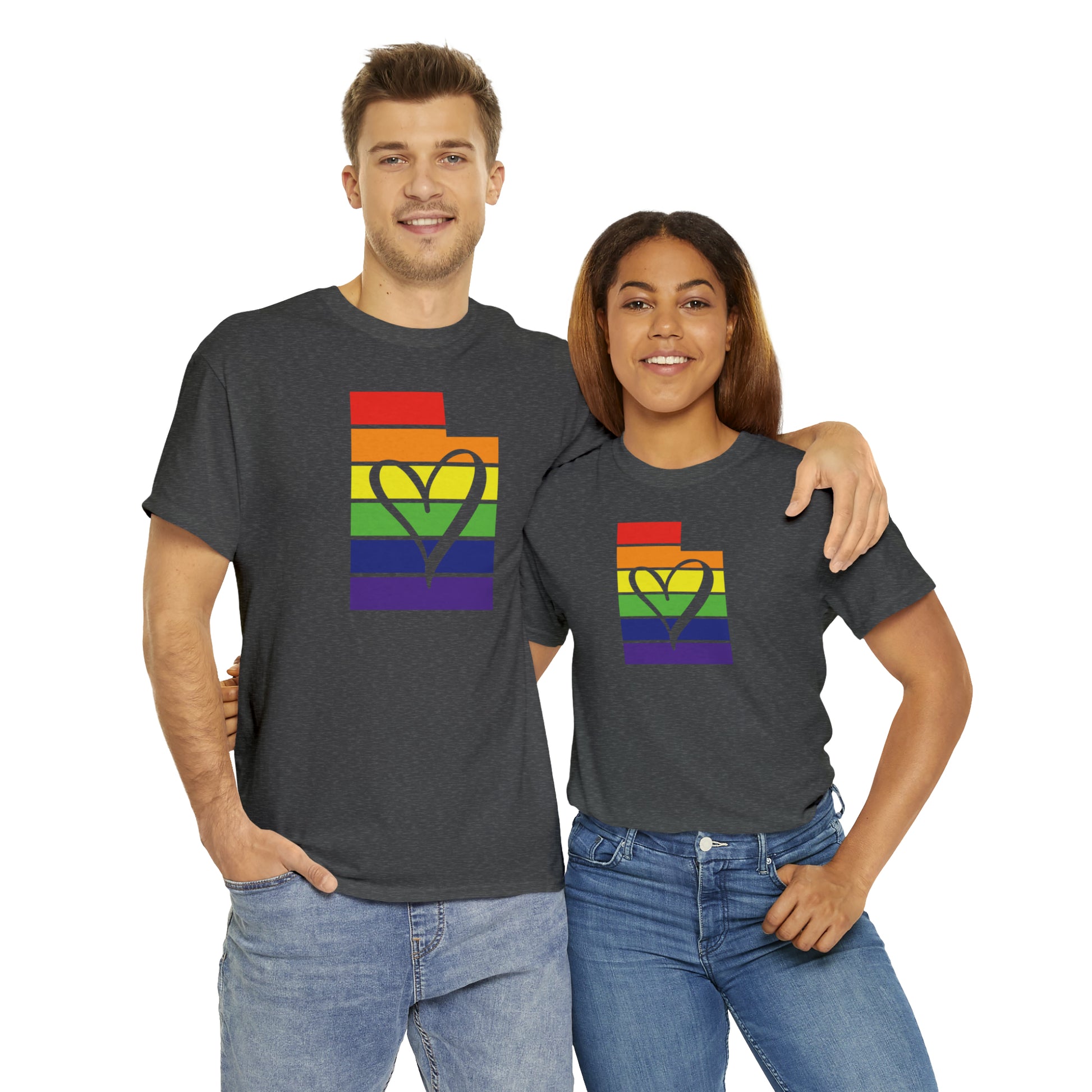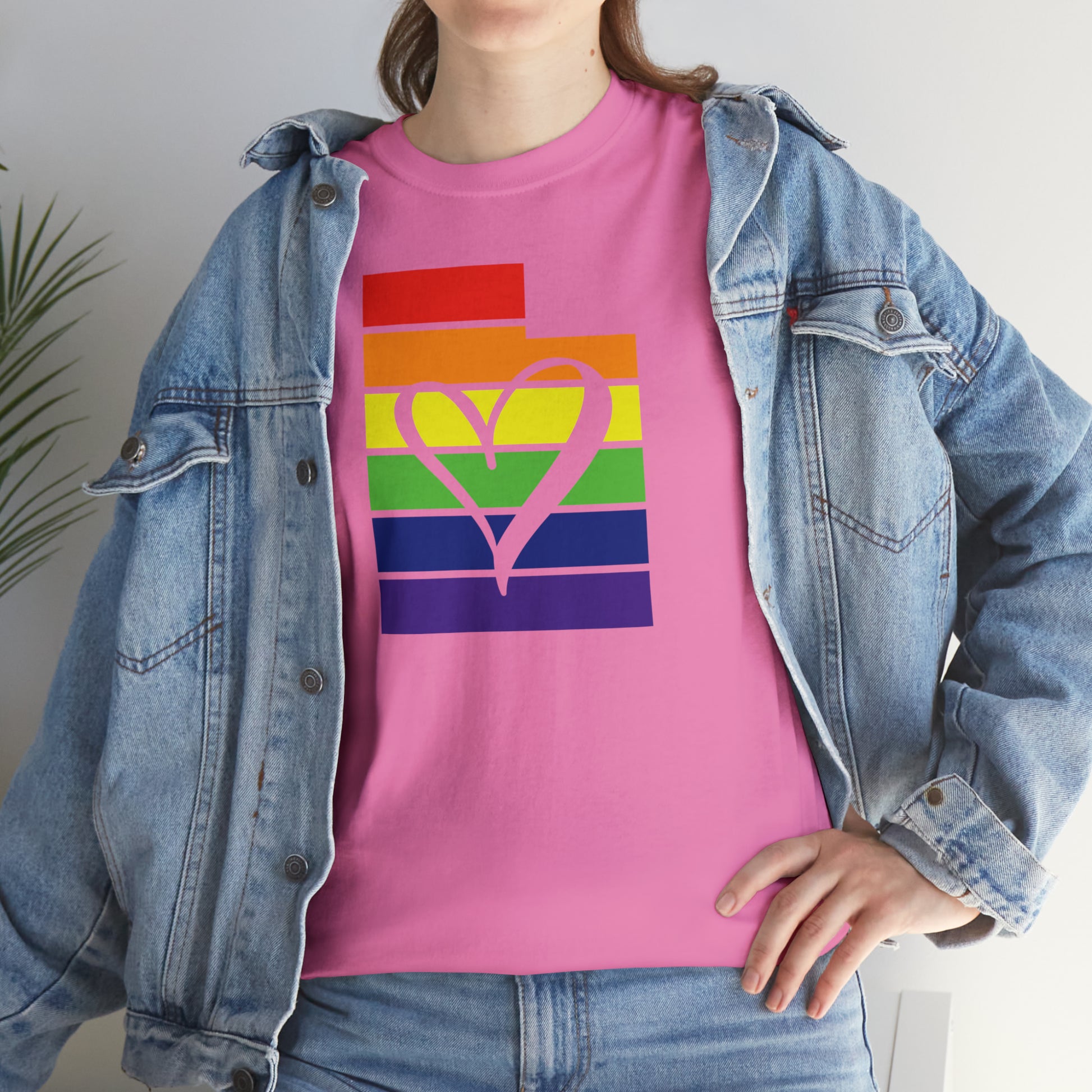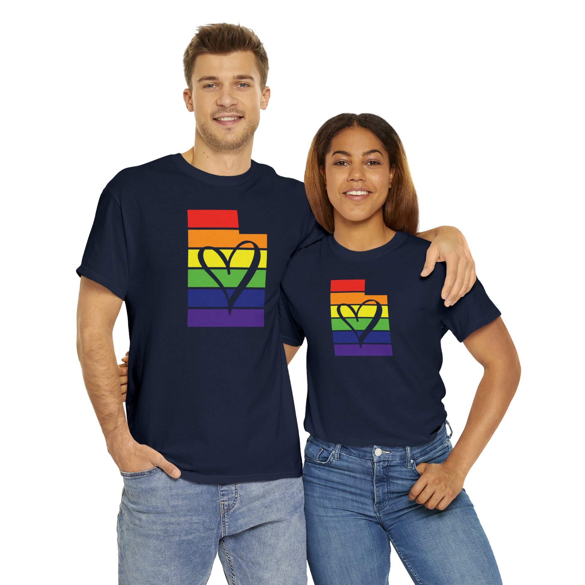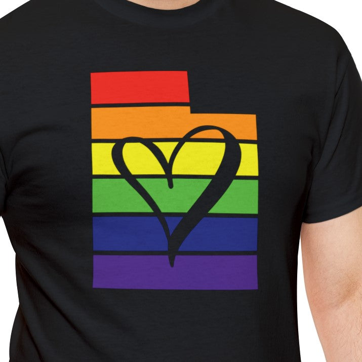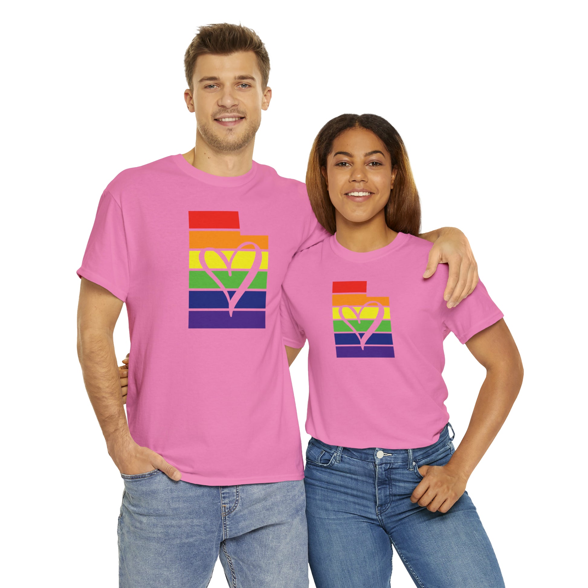UTAH! Celebrate Pride Month 2023! Let your colors fly with this soft, comfortable premium pride shirt. A rainbow state of Utah with a heart cutout is front and center. This commemorative tee completes any outfit. And it makes a terrific souvenir to remind you of the festivities for years to come! The shirt comes in several loud and proud colors with sizes up to 5XL!