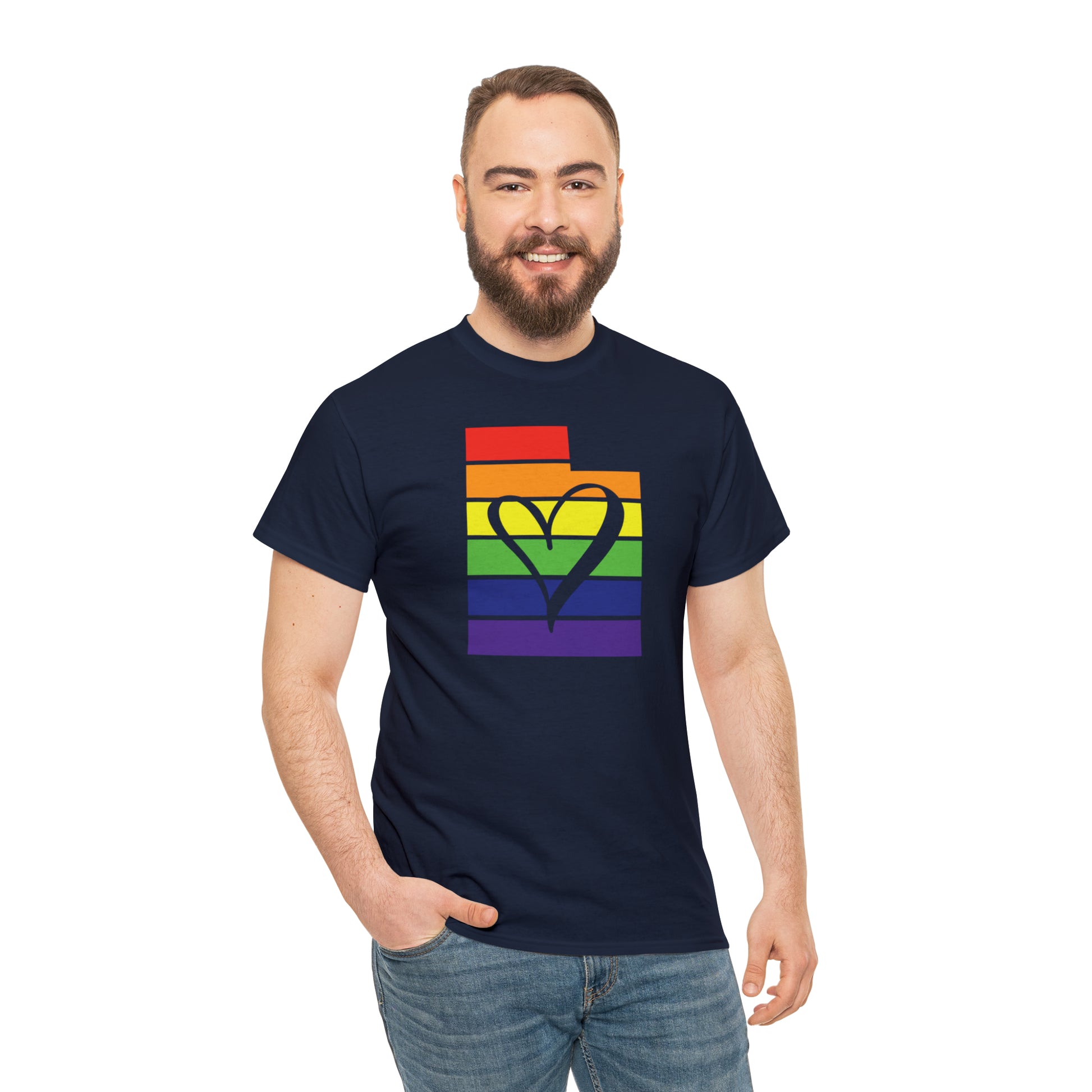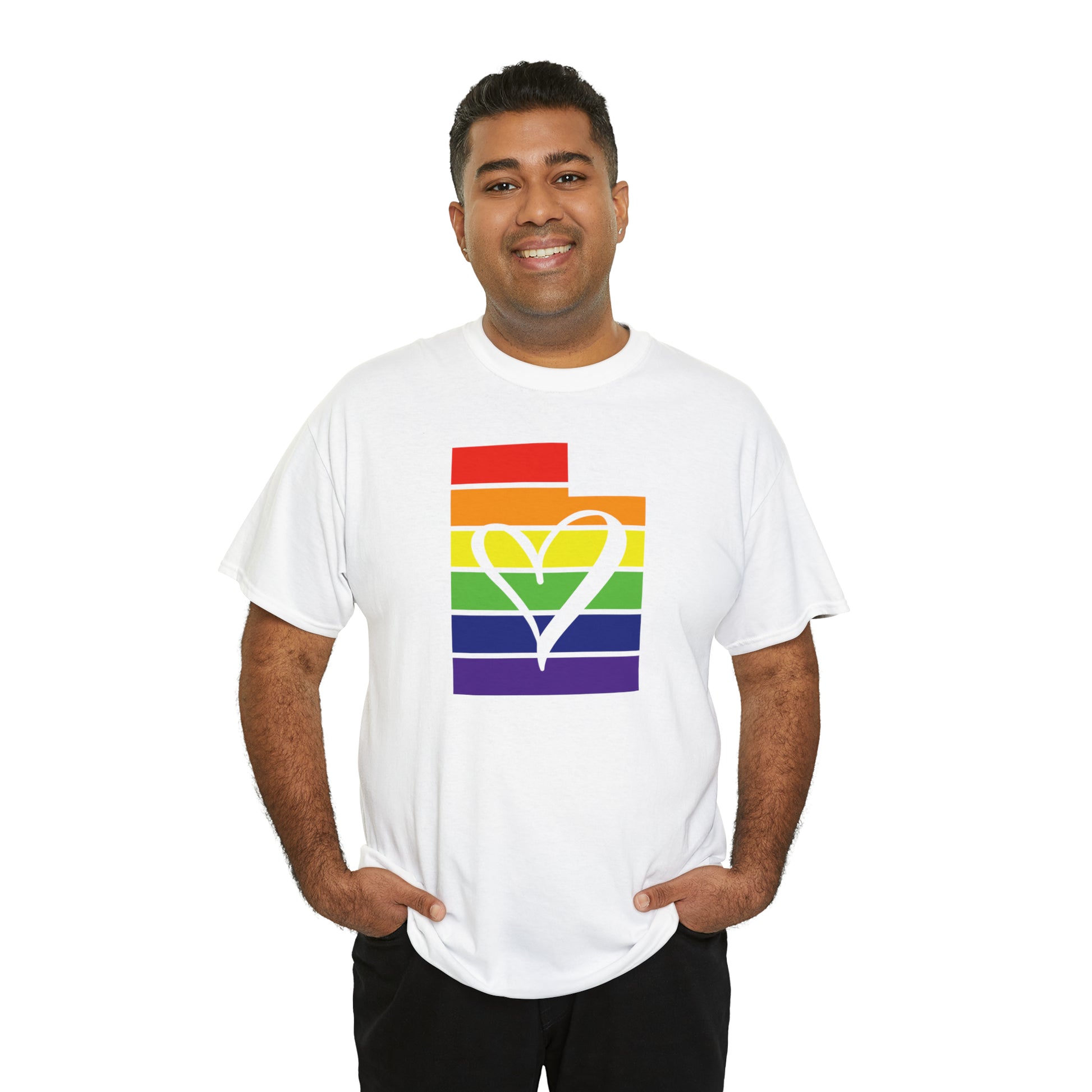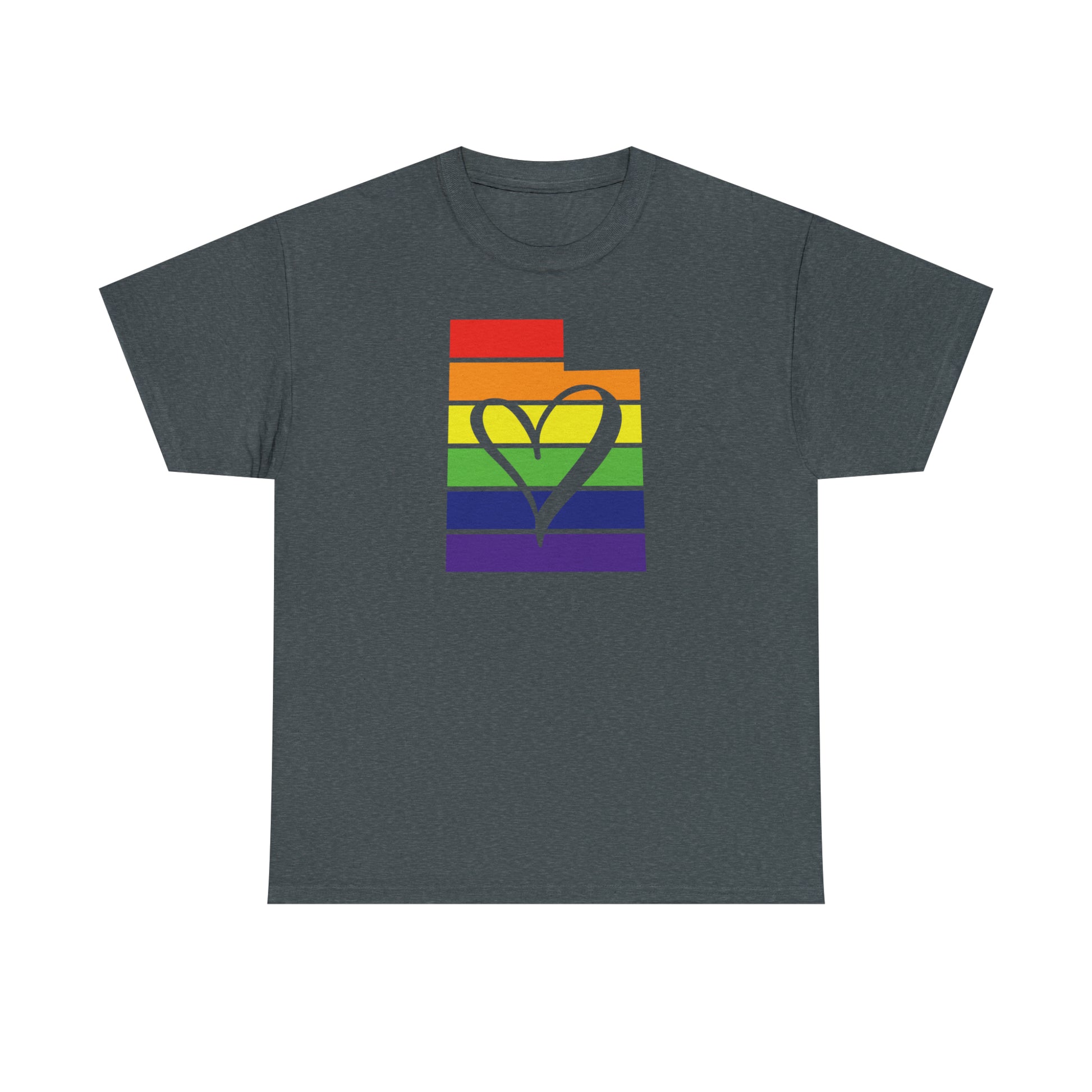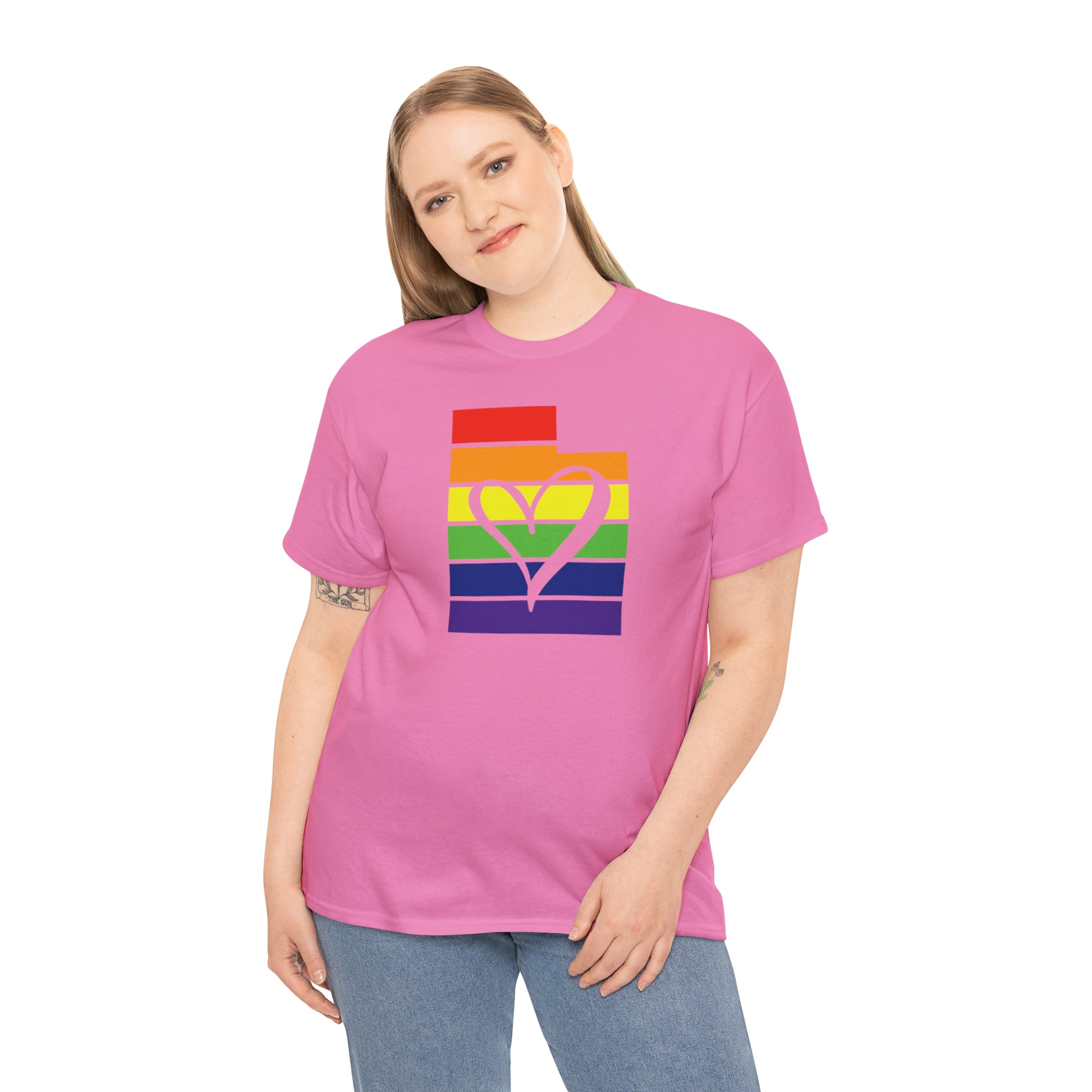 UTAH! Celebrate Pride Month 2023! Let your colors fly with this soft, comfortable premium pride shirt. A rainbow state of Utah with a heart cutout is front and center. This commemorative tee completes any outfit. And it makes a terrific souvenir to remind you of the festivities for years to come! The shirt comes in several loud and proud colors with sizes up to 5XL!