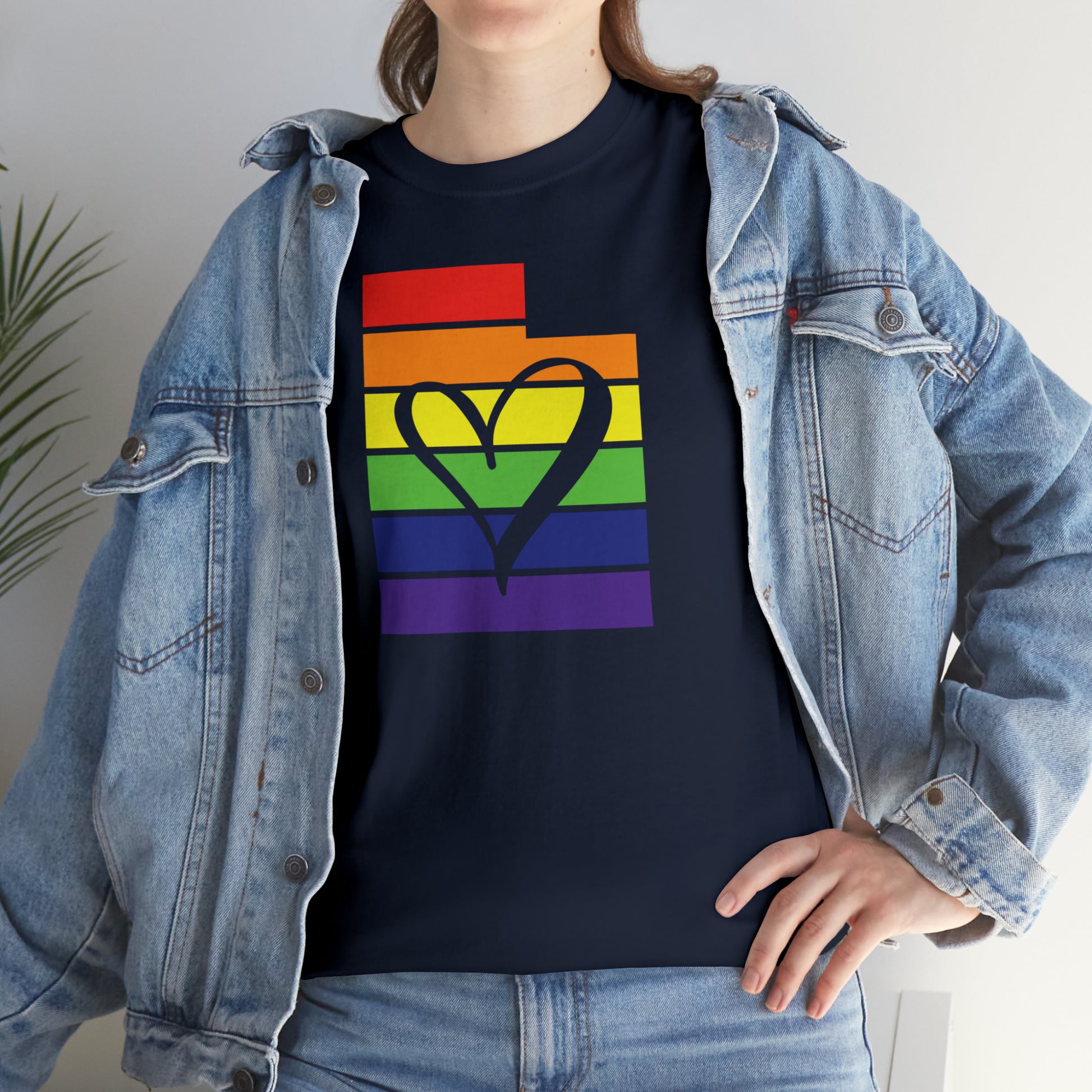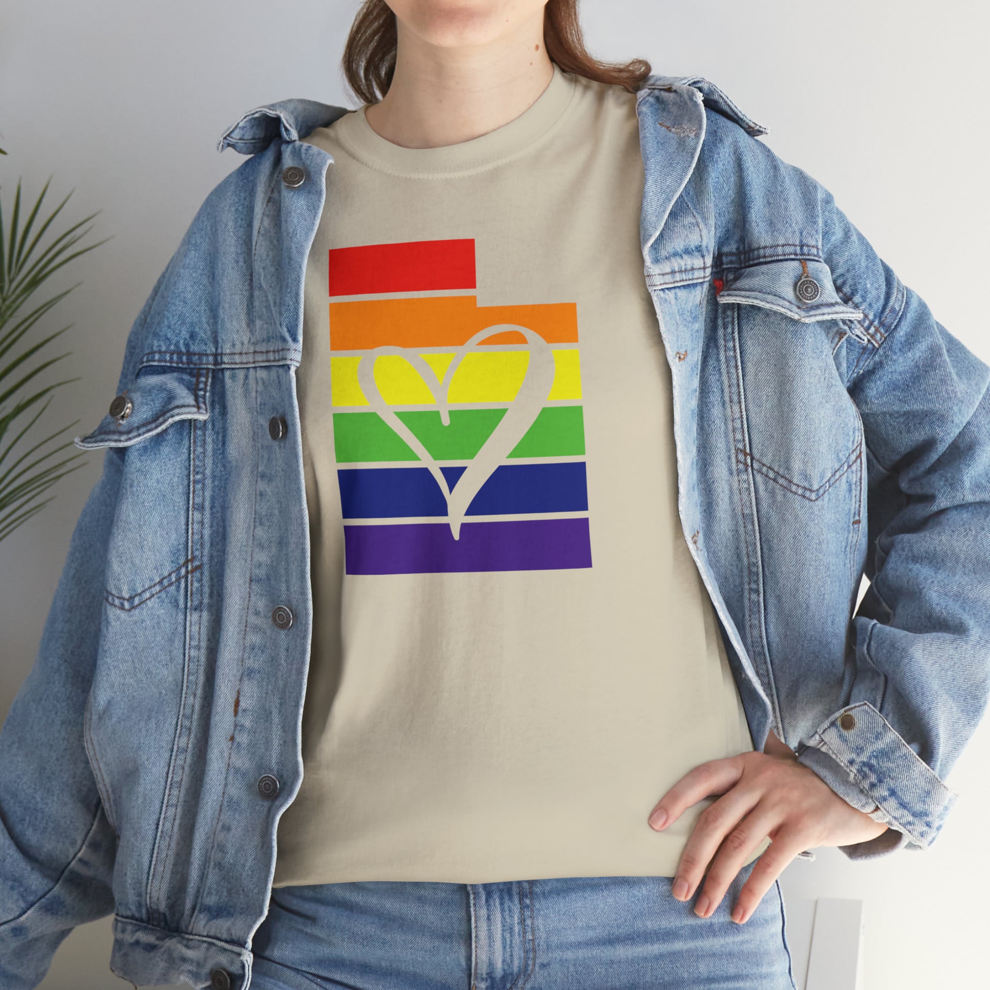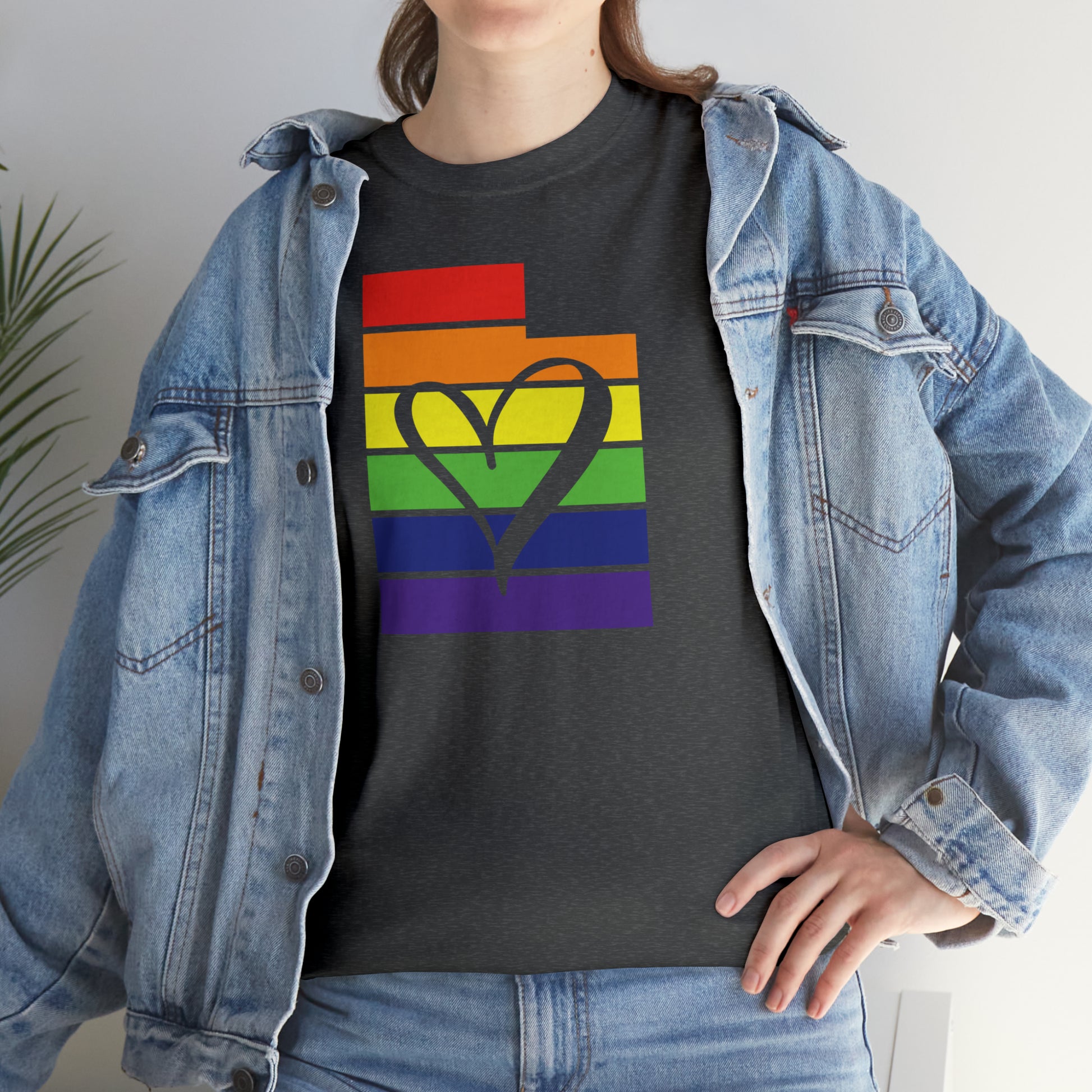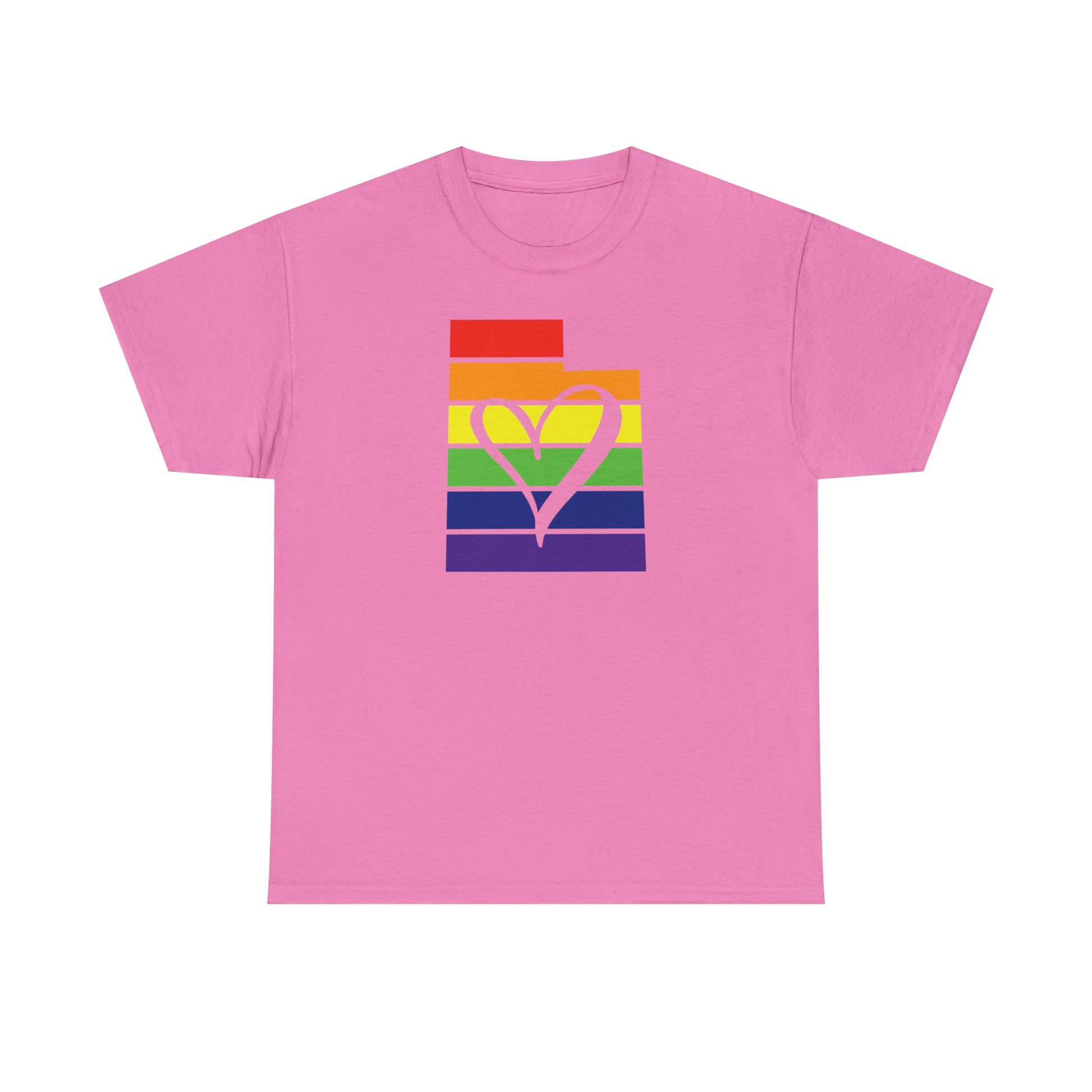 UTAH! Celebrate Pride Month 2023! Let your colors fly with this soft, comfortable premium pride shirt. A rainbow state of Utah with a heart cutout is front and center. This commemorative tee completes any outfit. And it makes a terrific souvenir to remind you of the festivities for years to come! The shirt comes in several loud and proud colors with sizes up to 5XL!