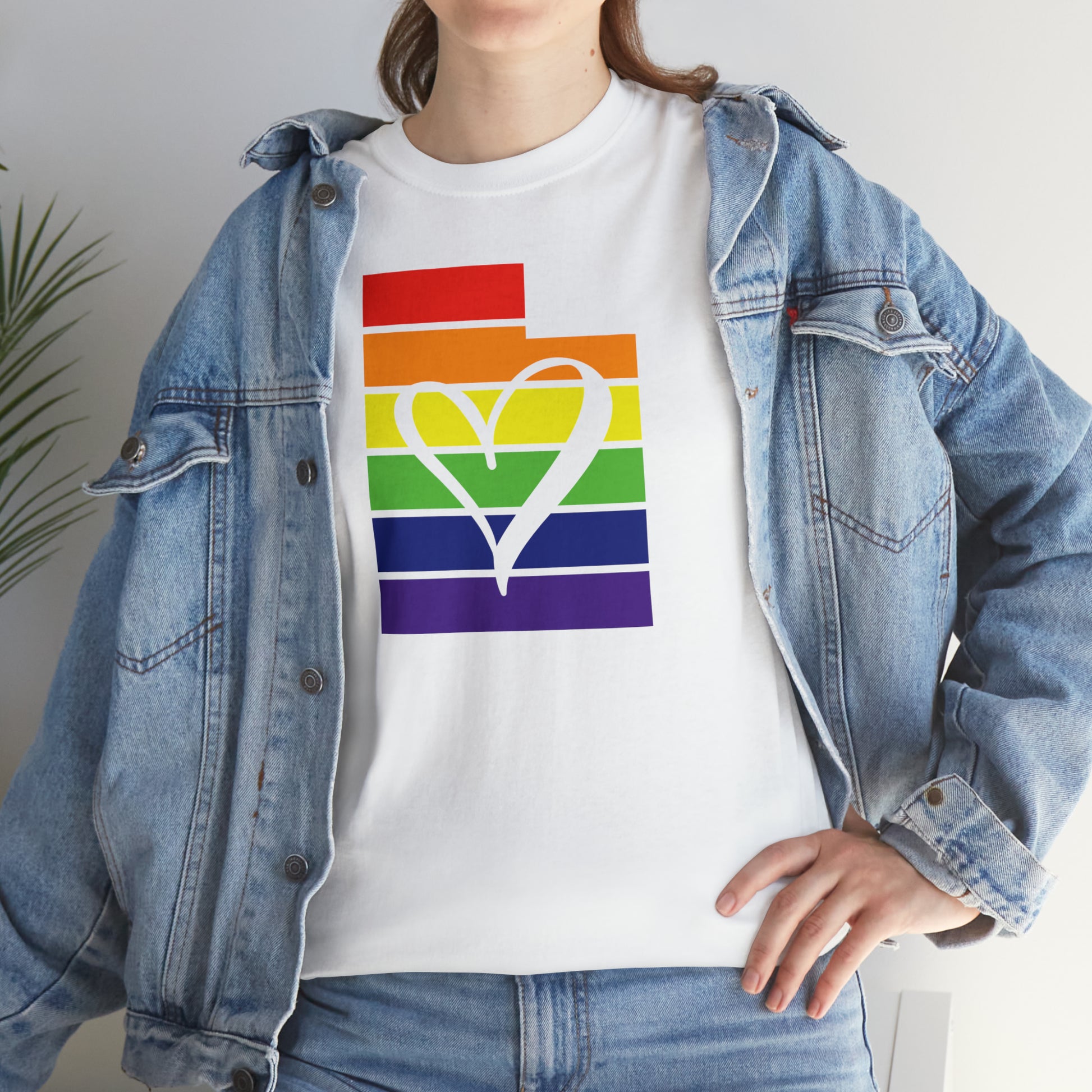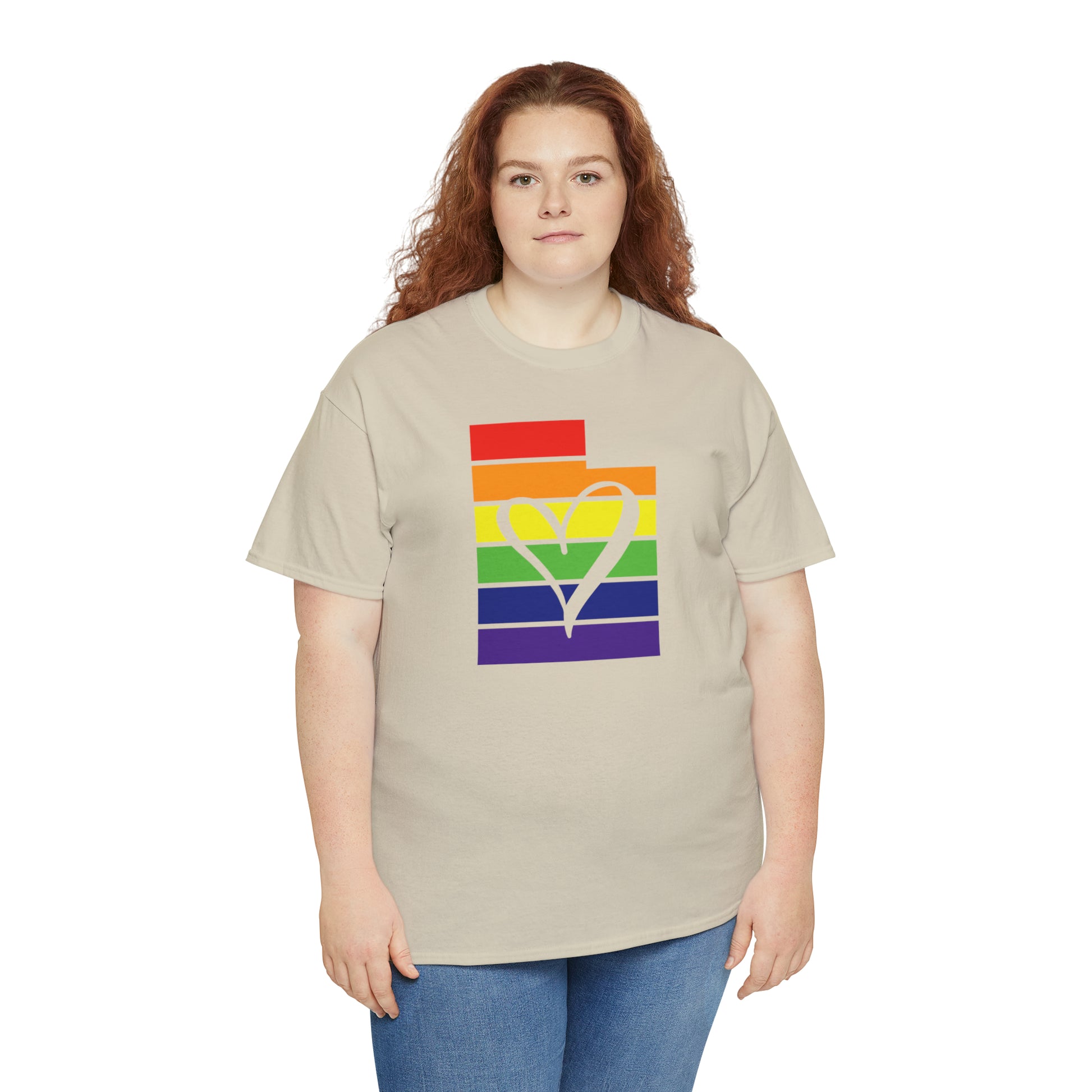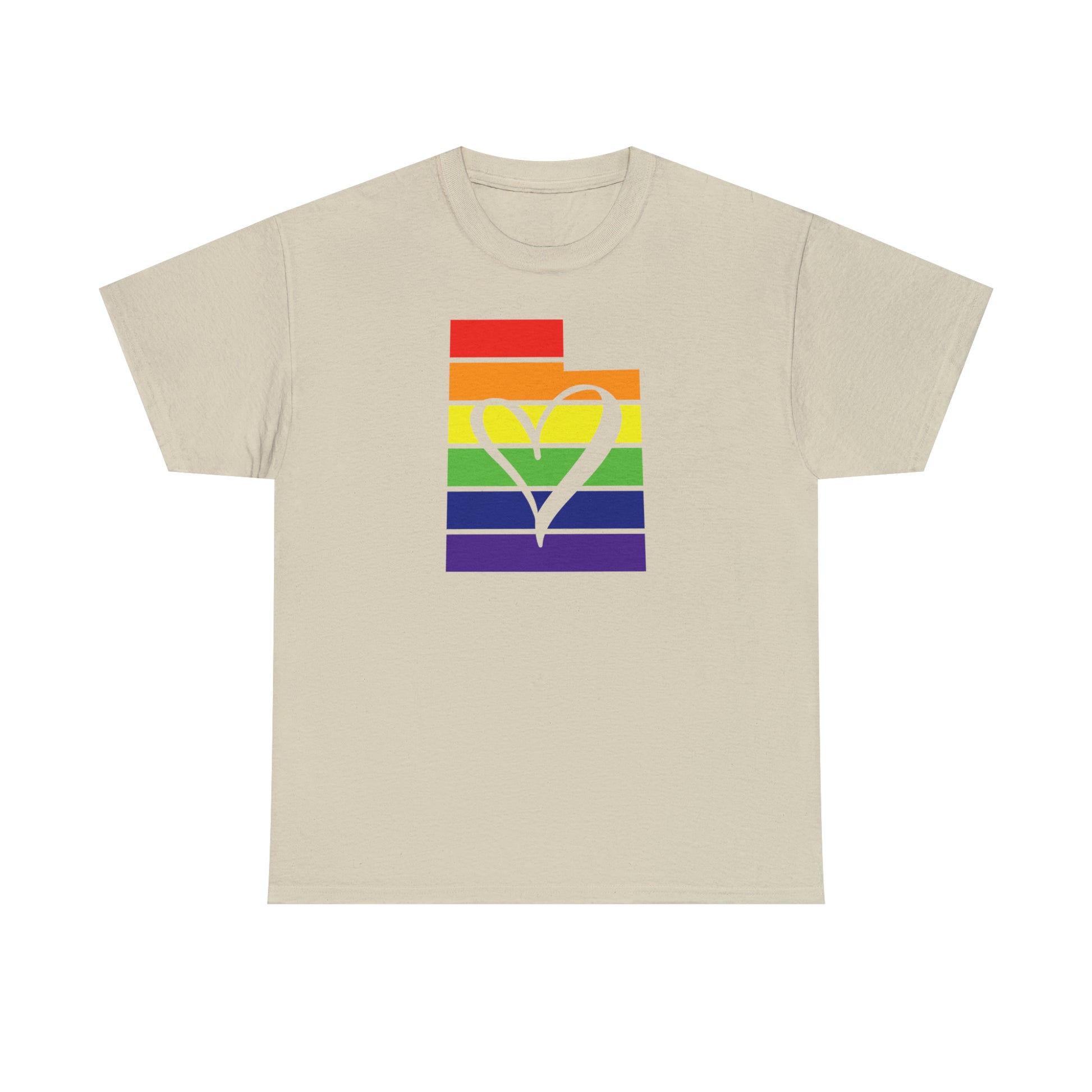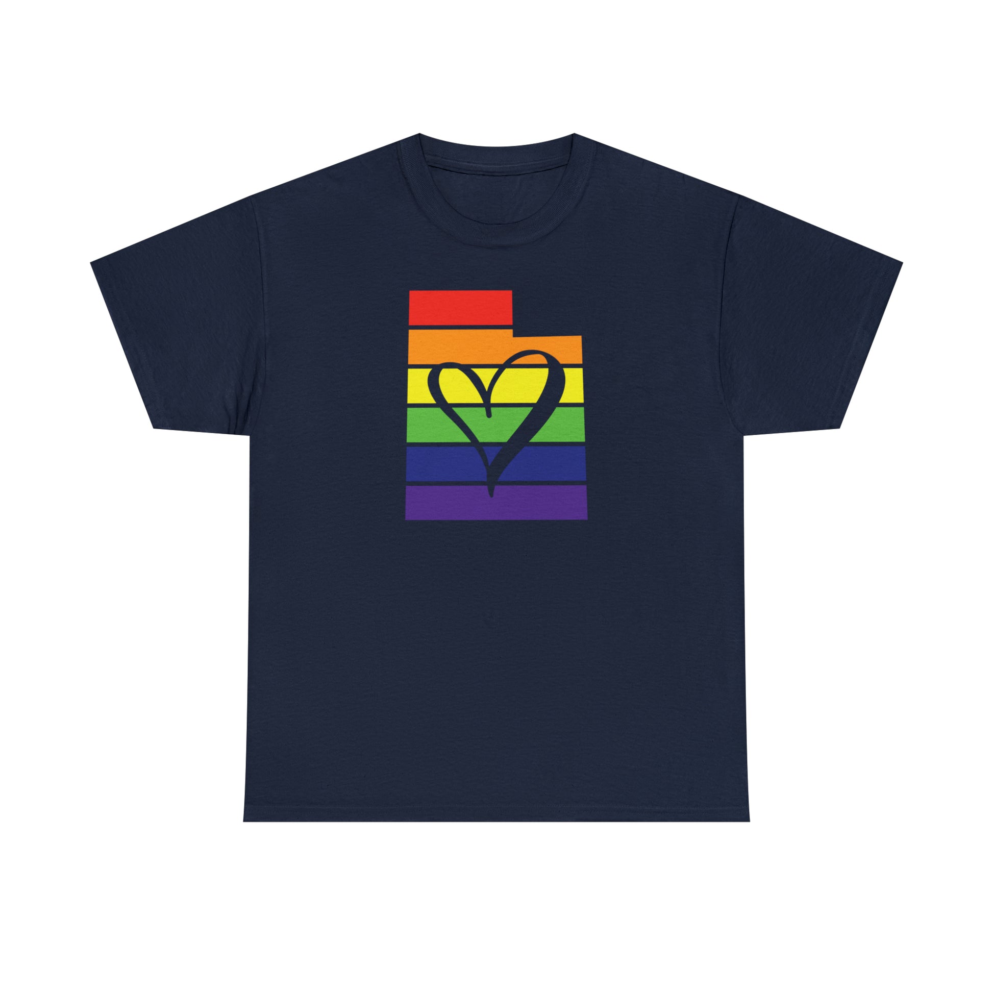 UTAH! Celebrate Pride Month 2023! Let your colors fly with this soft, comfortable premium pride shirt. A rainbow state of Utah with a heart cutout is front and center. This commemorative tee completes any outfit. And it makes a terrific souvenir to remind you of the festivities for years to come! The shirt comes in several loud and proud colors with sizes up to 5XL!